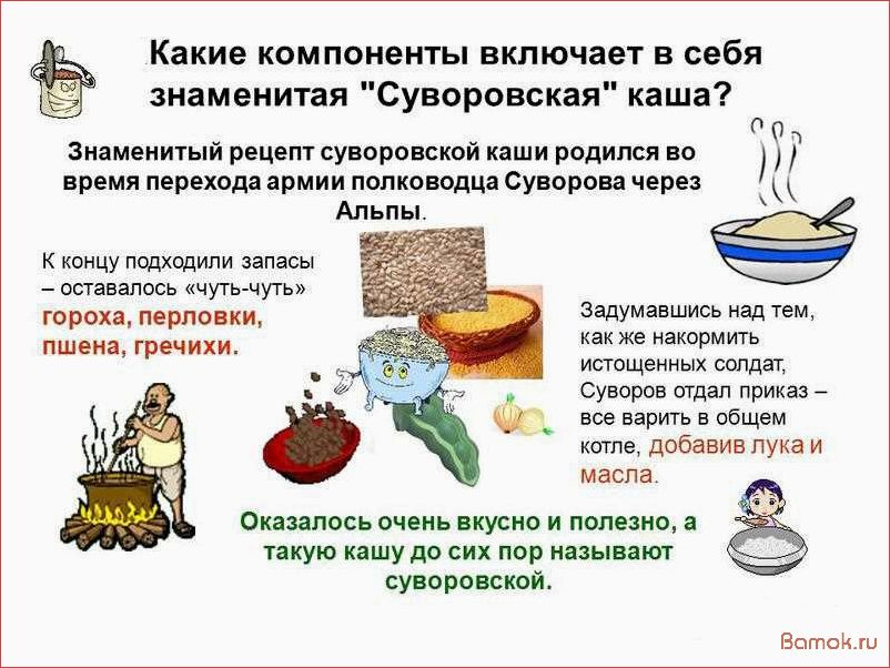 Читать далее »Суворовская каша — это одно из самых популярных блюд русской кухни. Название этой каши происходит от имени известного русского полководца Александра Суворова, который, по преданию, изобрел …