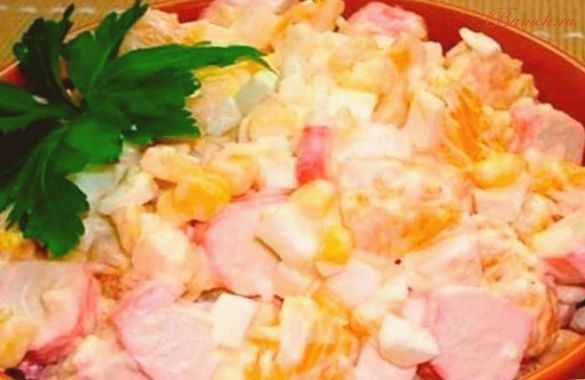 Читать далее »Подавать такой салат с апельсином и крабовыми палочками можно как на общем блюде, так и порционно, украсив зеленью и дольками цитрусовых. Ингредиенты: салат китайский триста г. …