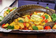 - Рыбу порезать на кусочки, поперчить, присолить, обжарить несколько мин. в нагретом масле, разложить на мультислойное бумажное полотенце для впитывания масла. Помидоры разрезать напополам, сыр — на кубики, смешать все с страничками шпината.